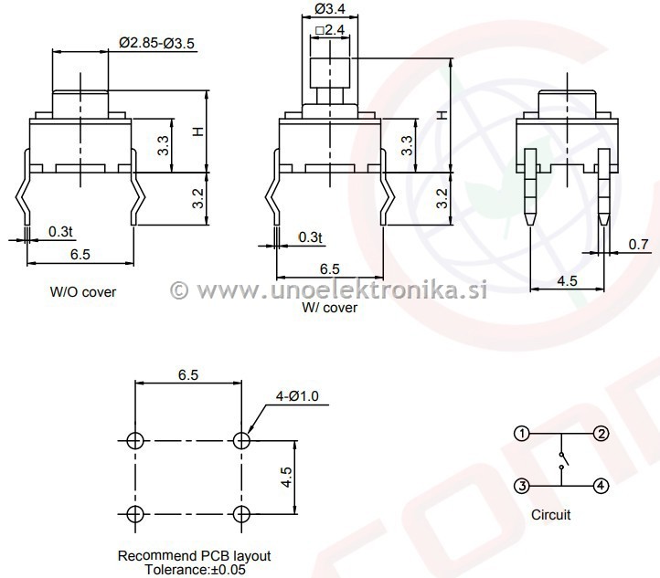 višina tipke merjeno od tiskanega vezja: H= 4,3 mm