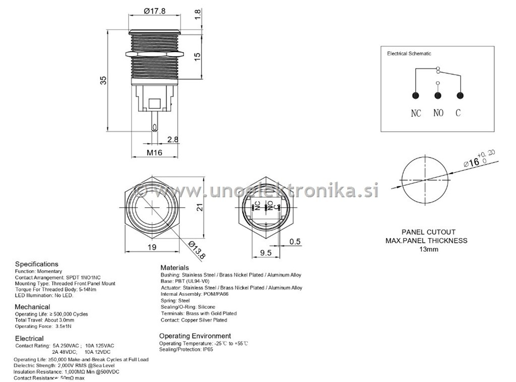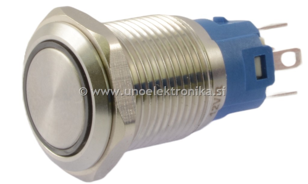 Tipka vodotesa 16mm, IP65, antivandalna, z osvetljenim rdečim LED obročem 12V AC/DC