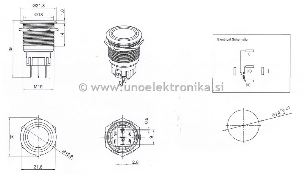 Stikalo vodotesno 19mm, IP67, antivandalno, z osvetljenim rdečim LED obročem 12V AC/DC