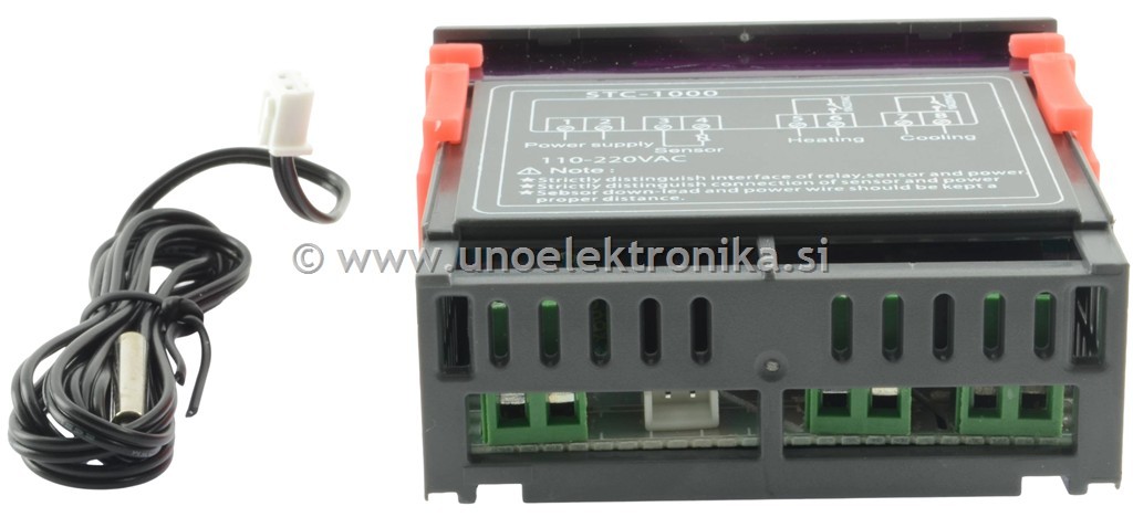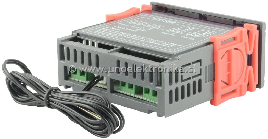 Digitalni termostat STC-1000 z 230 VAC napajanjem. Napajanje: 110-230 VAC Poraba: <3 W Izhod: 2x rele 10 A / 250 VAC Delovna temperatura: 0°C do 60°C Vlažnost: 20%–85% RH (brez kondenzacije) Temperaturna sonda: NTC fi 4x20 mm na kablu dolžine 1 m Dimenzije: 75 x 85 x 35 mm Teža: 138 g Barva zaslona: rdeča LED Digitalni termostat STC-1000 je vsestranski regulator temperature, primeren za uporabo v inkubatorjih, akvarijih, terarijih, hladilnikih, zamrzovalnikih, sušilnikih in drugih napravah, kjer je potreben natančen nadzor temperature. Omogoča samodejno preklapljanje med gretjem in hlajenjem, kar zagotavlja stabilno temperaturno okolje. Glavne funkcije: Dva neodvisna releja: eden za gretje, drugi za hlajenje Nastavljiv temperaturni razpon: -50°C do +99.9°C Ločljivost prikaza: 0.1°C Natančnost: ±1°C Funkcija zakasnitve vklopa kompresorja: 1–10 minut Kalibracija sonde: možnost prilagoditve meritve Vodoodporna NTC sonda dolžine 1 meter Enostavno nastavljanje preko tipk in LED zaslona Uporaba: Inkubatorji za perutnino Akvariji in terariji Hladilne in grelne komore Dekristalizatorji medu Domači projekti avtomatizacije Vsebina paketa: STC-1000 termostat NTC temperaturna sonda (vodoodporna, 1m) Navodila za uporabo Garancija: 12 mesecev>