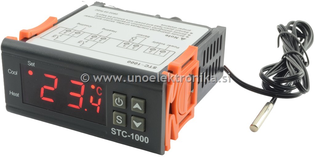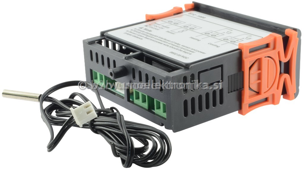 Digitalni termostat STC-1000 z 12 VDC napajanjem. Napajanje: 12 VDC Poraba: <3 W Izhod: 2x rele 10 A / 250 VAC Delovna temperatura: 0°C do 60°C Vlažnost: 20%–85% RH (brez kondenzacije) Temperaturna sonda: NTC fi 4x20 mm na kablu dolžine 1 m Dimenzije: 75 x 85 x 35 mm Teža: 138 g Barva zaslona: rdeča LED Digitalni termostat STC-1000 je vsestranski regulator temperature, primeren za uporabo v inkubatorjih, akvarijih, terarijih, hladilnikih, zamrzovalnikih, sušilnikih in drugih napravah, kjer je potreben natančen nadzor temperature. Omogoča samodejno preklapljanje med gretjem in hlajenjem, kar zagotavlja stabilno temperaturno okolje. Glavne funkcije: Dva neodvisna releja: eden za gretje, drugi za hlajenje Nastavljiv temperaturni razpon: -50°C do +99.9°C Ločljivost prikaza: 0.1°C Natančnost: ±1°C Funkcija zakasnitve vklopa kompresorja: 1–10 minut Kalibracija sonde: možnost prilagoditve meritve Vodoodporna NTC sonda dolžine 1 meter Enostavno nastavljanje preko tipk in LED zaslona Uporaba: Inkubatorji za perutnino Akvariji in terariji Hladilne in grelne komore Dekristalizatorji medu Domači projekti avtomatizacije Vsebina paketa: STC-1000 termostat NTC temperaturna sonda (vodoodporna, 1m) Navodila za uporabo Garancija: 12 mesecev