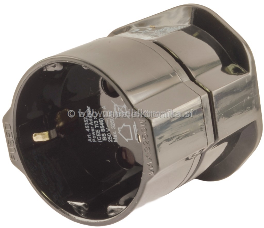 za priključitev naprav iz Evropskih držav (type F, CEE 7/3) na Angleške ( Velika Britanija, Japonska, Malta, Irska, Singapore, Malesija ) vtičnice (type G, BS 8546)