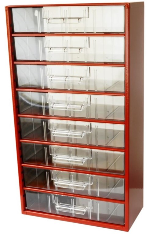 Sortirni predalnik v kovinskem ohišju s plastičnimi predali so idealani za hranjenje elektronske in elektromehanske elemente.