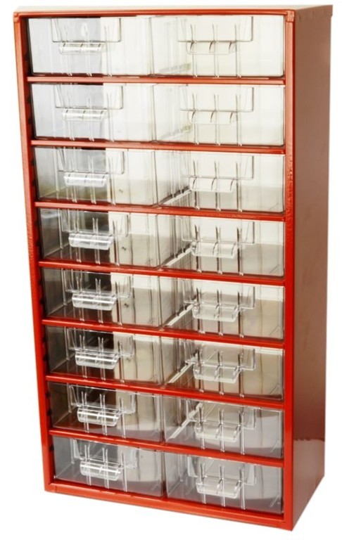Sortirni predalnik v kovinskem ohišju s plastičnimi predali so idealani za hranjenje elektronske in elektromehanske elemente.